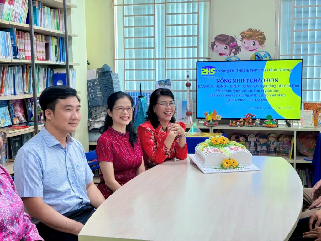 Sáng 18/11/2025, trường TH, THCS & THPT Thái Bình Dương (PHS) vinh dự đón tiếp đoàn công tác do cô Trương Lê Mỹ Ngọc- Bí thư Đảng ủy, Chủ tịch Hội đồng nhân dân và các đại diện lãnh đạo Phường Tân Sơn Hòa đến thăm, tặng quà, chúc mừng nhân kỷ niệm 43 năm Ngày Nhà giáo Việt Nam.