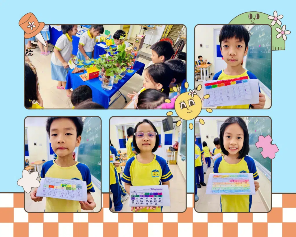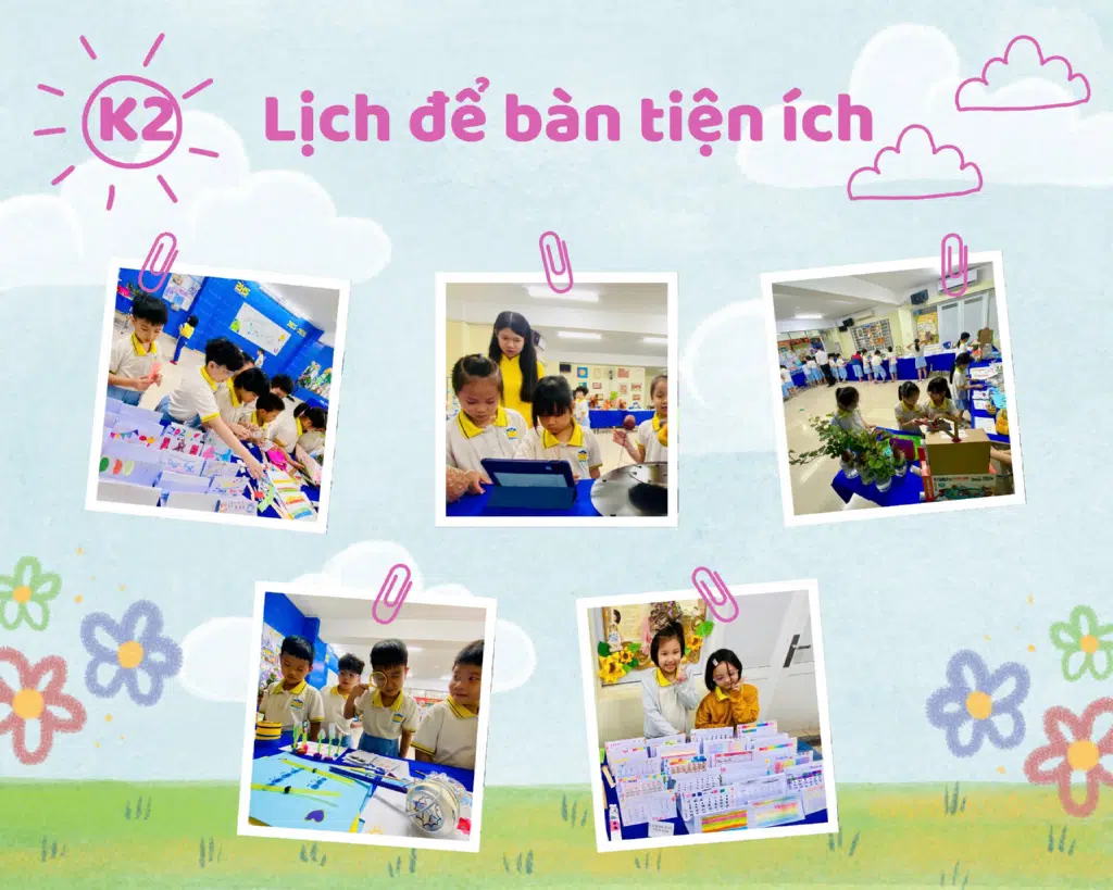 Các bạn nhỏ lớp 2 tham dự triển lãm STEAM ở trường nhưng không quên “khoe” sản phẩm của lớp mình, đó là tự tay thiết kế những bộ “Lịch để bàn tiện ích” để chào đón năm mới! 🎨